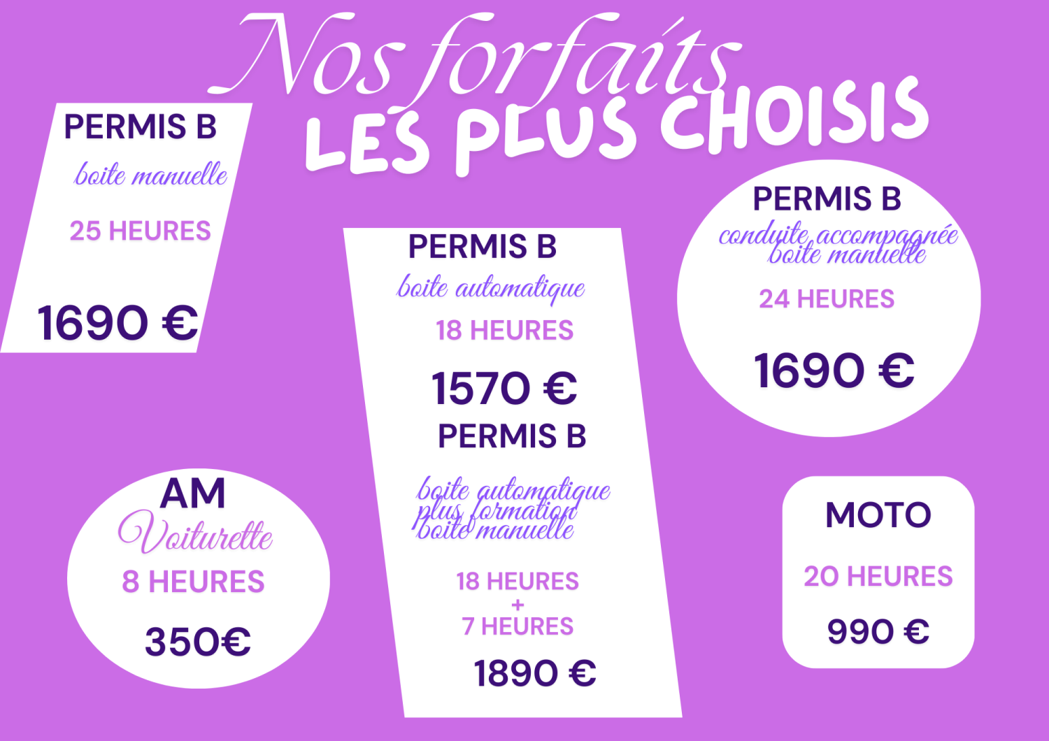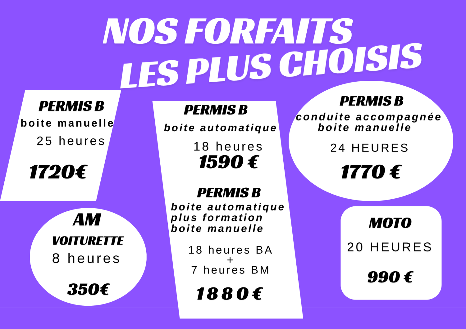 Le permis AM (BSR) , le permis moto , la formation passerelle (A2 vers A) , la formation 125 , le permis auto (plusieurs forfaits vous sont proposés afin de suivre votre formation à votre rythme), et la conduite accompagnée (AAC) .